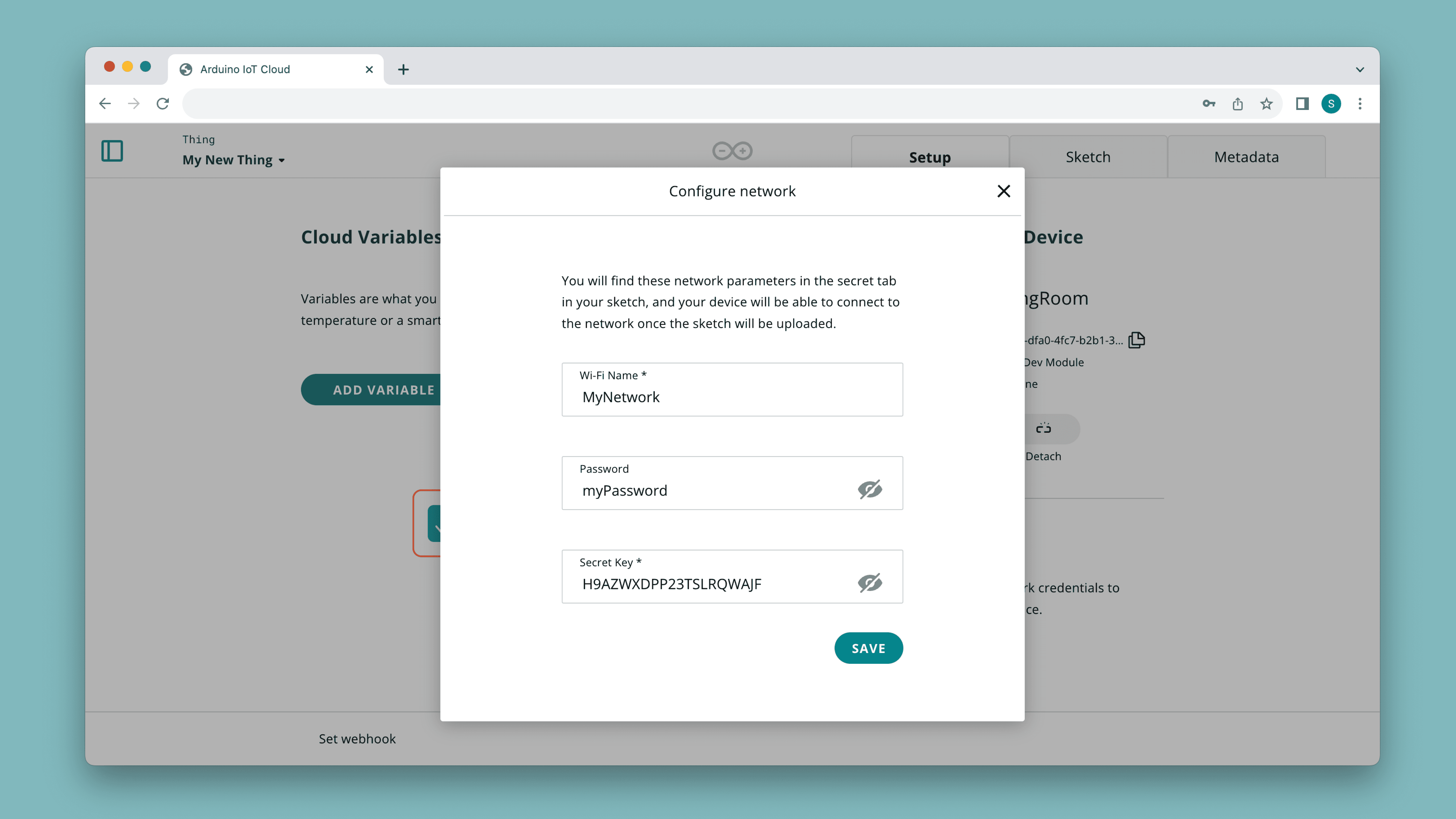 The credentials entered are automatically included in your sketch (see automatic sketch generation).