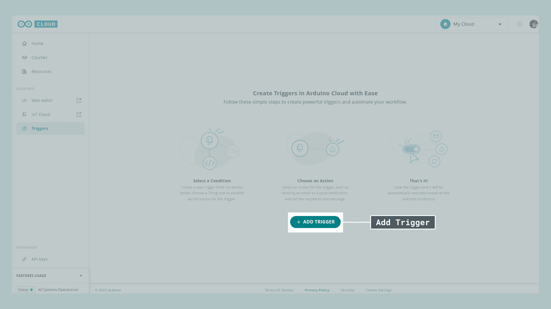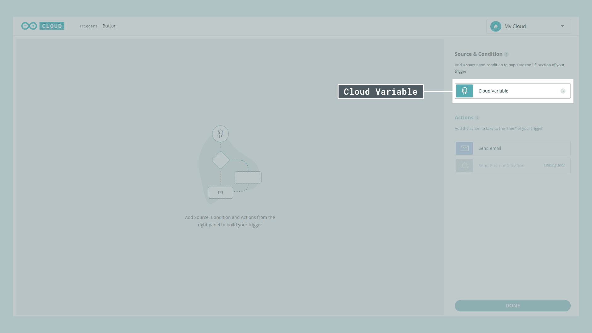 Triggers react to certain conditions inside your Arduino Cloud Thing, such as a boolean being true, or a string being assigned a value. As soon as a set condition is met a notification gets triggered and sent to you. This is useful when you monitor data and you need to know about any change as soon as it happens. This could be anything from different values in environmental monitoring or security-related information such as movement detection.