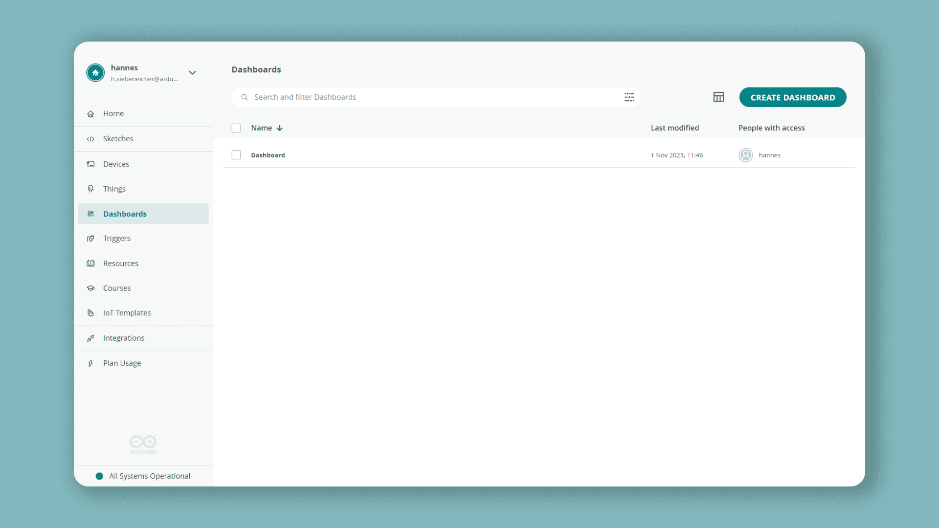 First, to download historical data navigate into one of your dashboards on the Arduino Cloud.