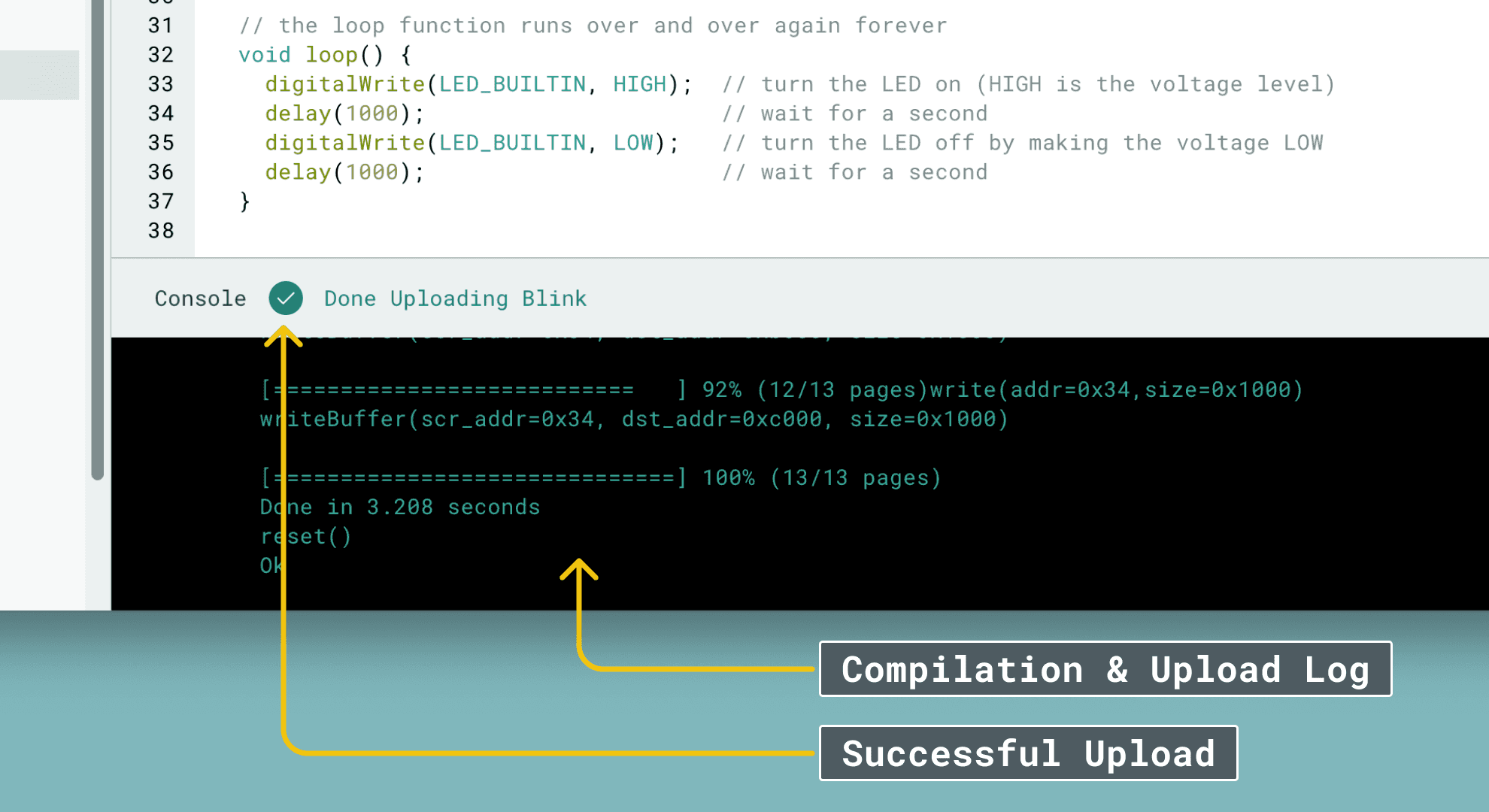 6. Console Log - this window informs you of the status of your compilation / upload.