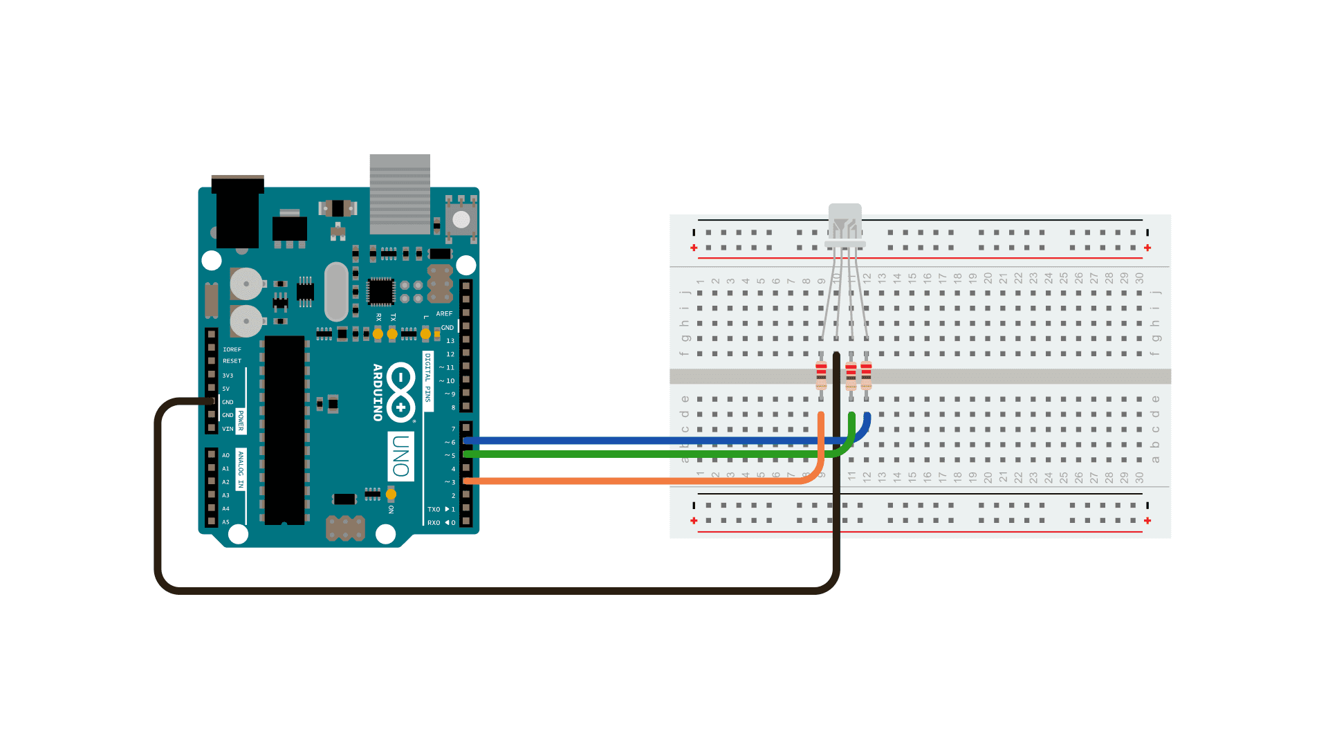 With your remaining wires, connect your red cathode to pin 3, green cathode to pin 5, and blue cathode to pin 6 in series with the resistors.