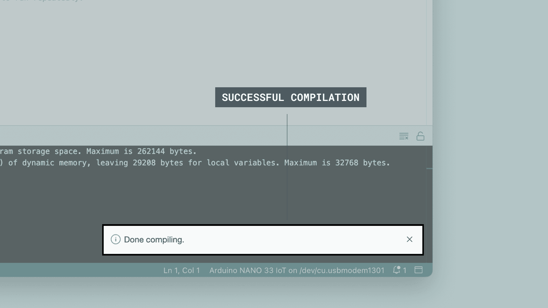 Successful compilation printed in the console.