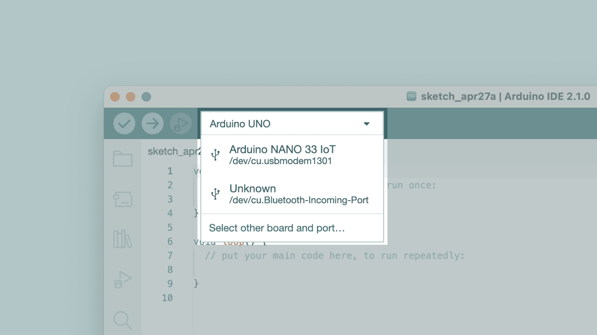 3. But before doing any of that, we should choose what board we are uploading to. Beside the verify and upload button you should see a a drop down menu, this will, in most cases, display Arduino boards that are connected to your computer. If your board is not automatically detected, you can either press "Select other board and port..." in the drop-down and follow the instructions, or go to Tools > Board and Tools > Port in the toolbar menu to select the board and port manually.