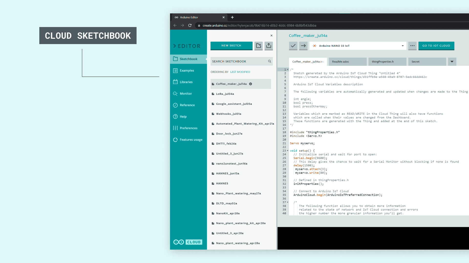 Code anywhere: Write your Arduino sketches on one computer and access them on another, with a single click! Do not worry about synchronisation or USB drives: the Arduino IDE 2 provides the Remote Sketches feature which allows you to store your sketches in the Arduino secure Cloud and retrieve them easily on any other workstation.
