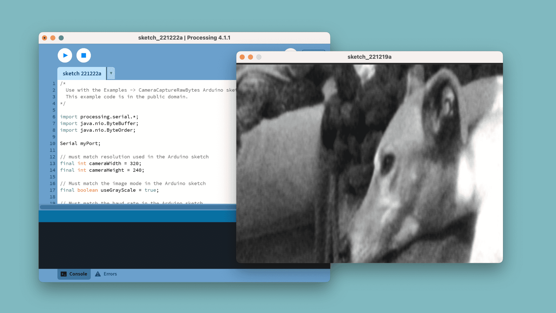 This example allows you to stream the sensor data from your camera to a Processing application, using serial over USB. This will allow you to see the image directly in your computer.