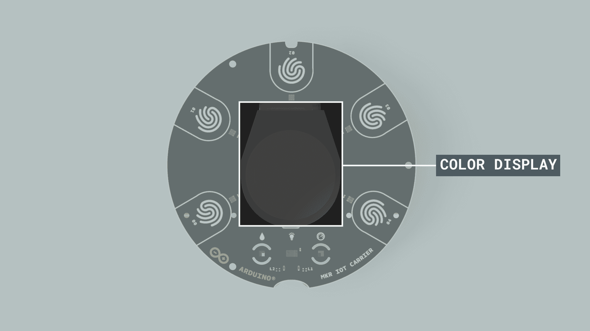 The MKR IoT Carrier contains a Broadcom APDS-9960 RGB and Gesture sensors, situated under the display and marked with a bulb icon. The sensor is useful for ambient light and RGB color sensing, proximity sensing, and gesture detection.