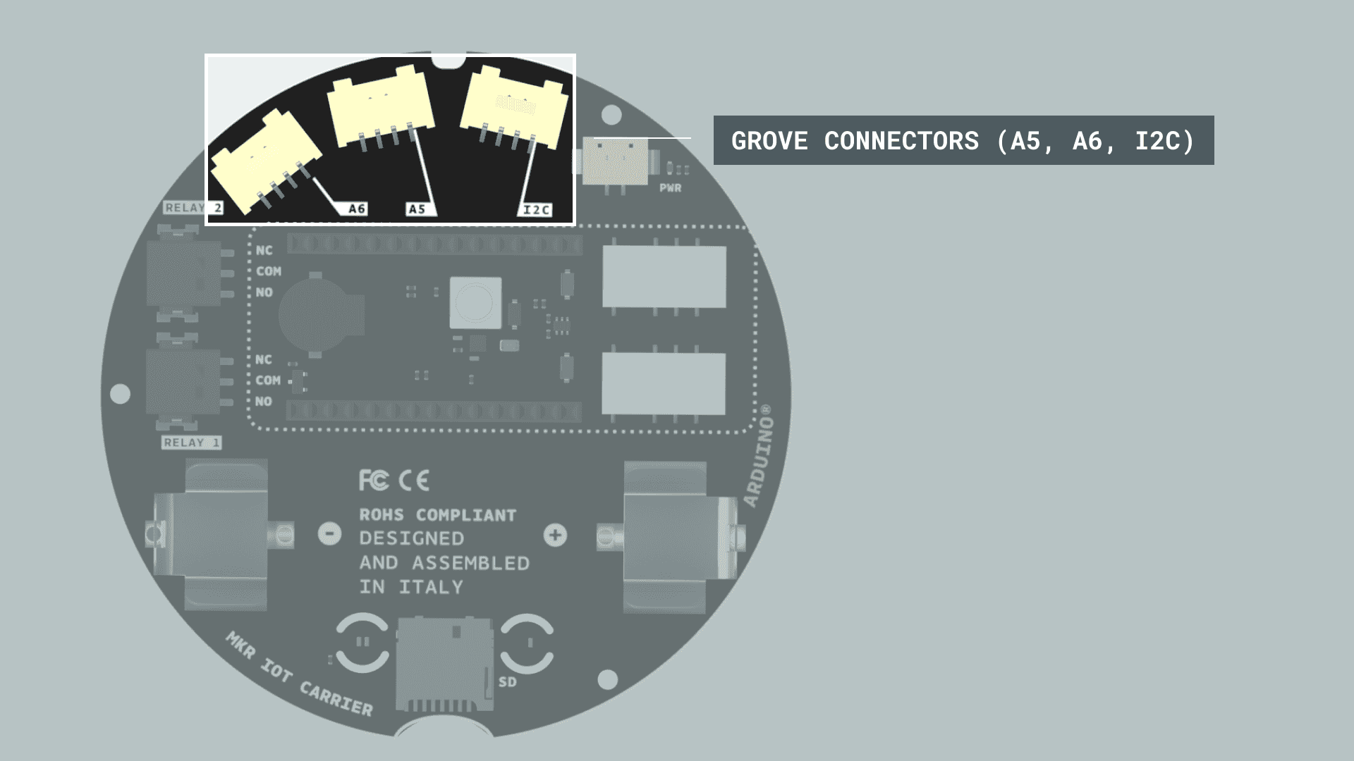 The MKR IoT Carrier comes with three grove connectors (2 analog and 1 I2C) that enables us to easily connect external sensors. The type of the connector is labeled clearly on the back of the carrier.