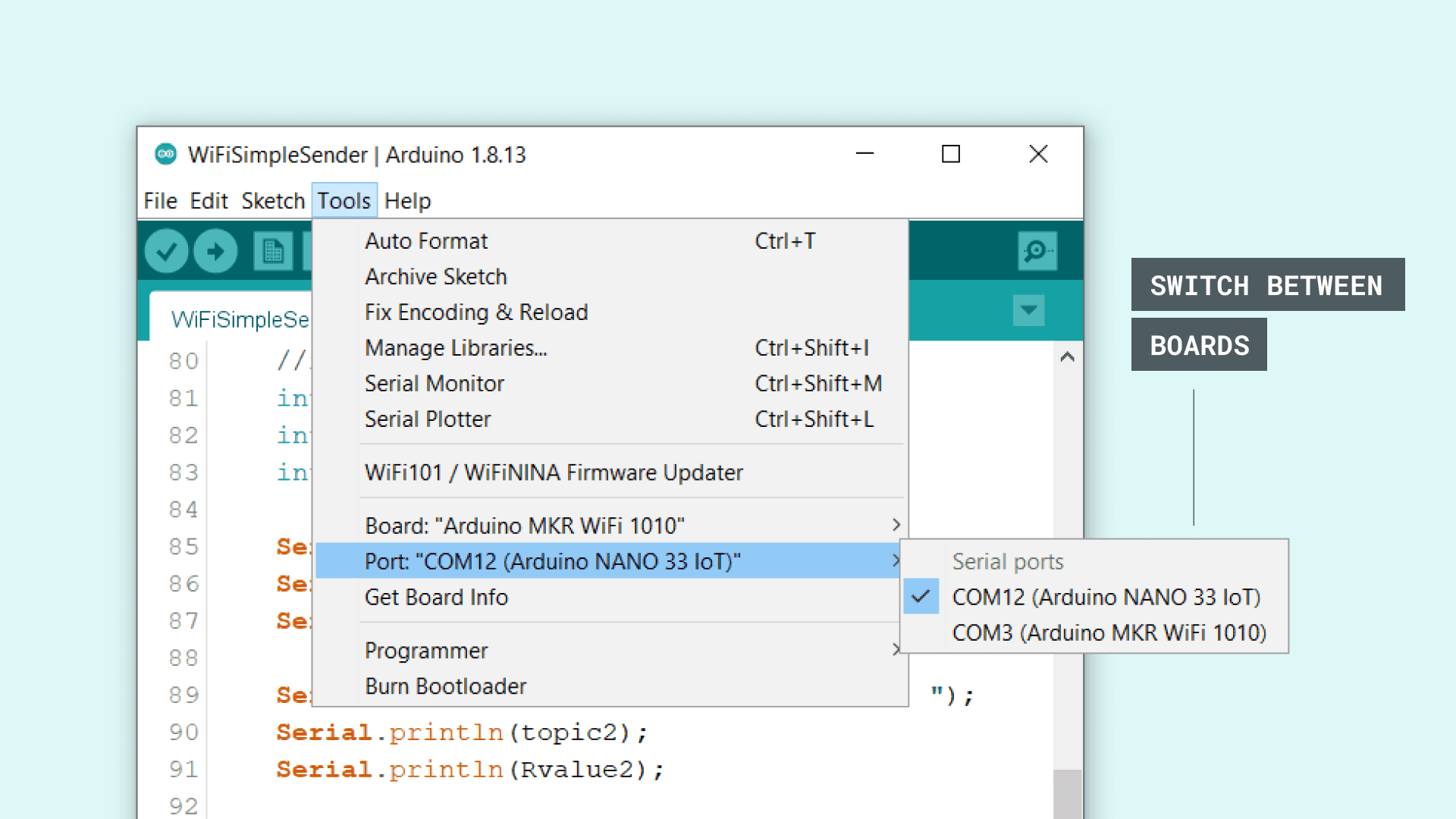 In this tutorial, a MKR WiFi 1010 board and a Nano 33 IoT board was used. When switching between the ports, we can see them listed as COM12 and COM3.