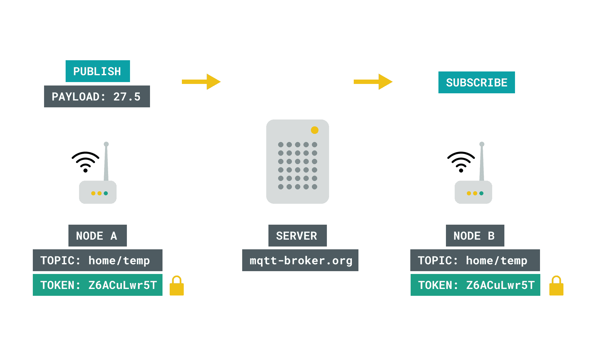 A basic explanation on how it works is that a node, for example and Arduino with a Wi-Fi module, sends a payload to a broker. A broker is a kind of "middle-point" server, that essentially stores payloads sent to it, in something called topics. A topic, is a definition of what type of data it contains, it could for example be "basement humidity" or "living room temperature". Another node can then subscribe to this information, from the broker, and voilà, data has been moved from Node A to Node B over the Internet.