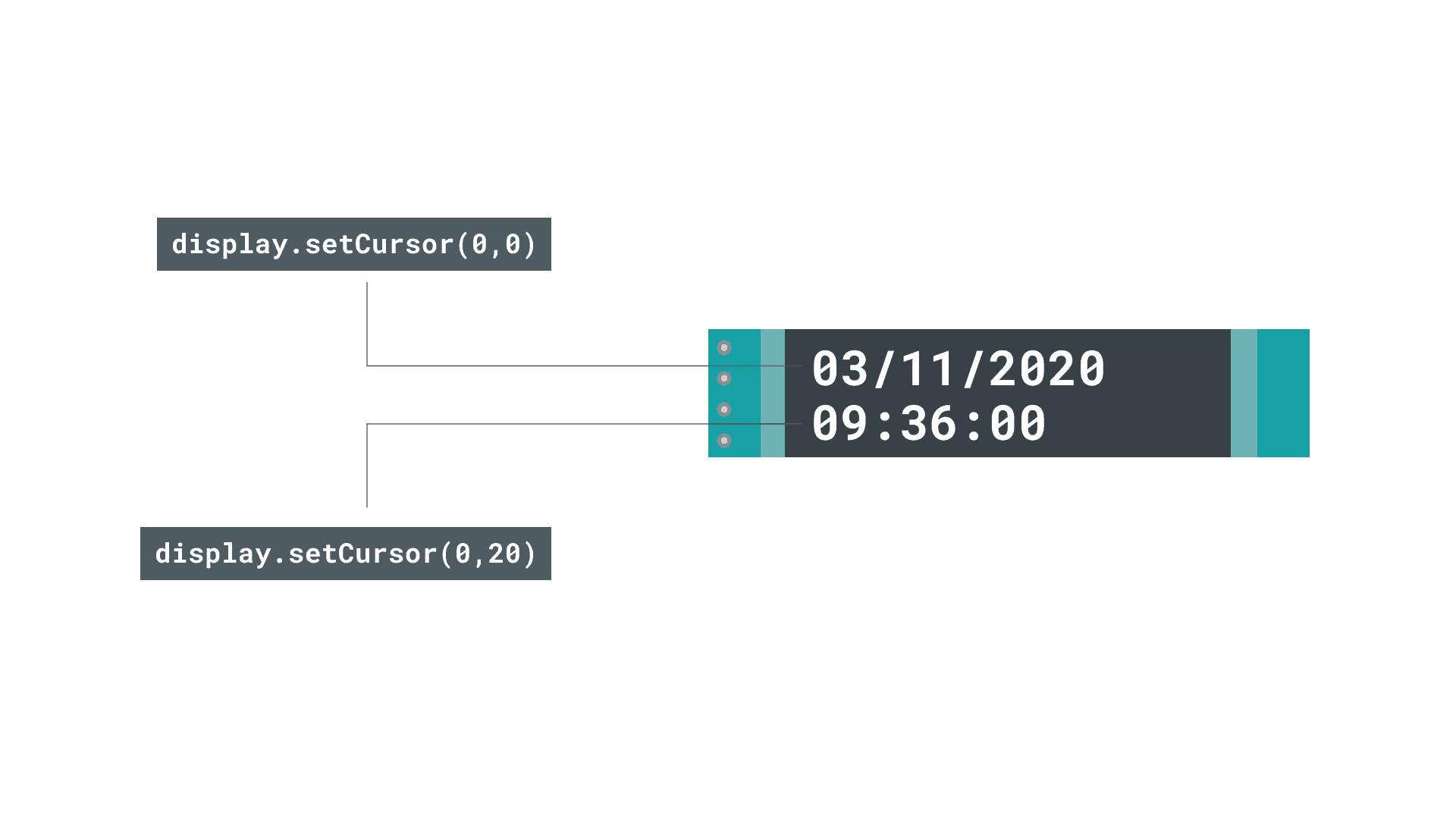 68 display.setCursor(0, 18); //change cursor to second row69 print2digits(rtc.getHours()); //retrieve hours70 display.print(":");71 print2digits(rtc.getMinutes()); //retrieve minutes72 display.print(":");73 print2digits(rtc.getSeconds()); //retrieve seconds74 75 display.display(); //print to display76