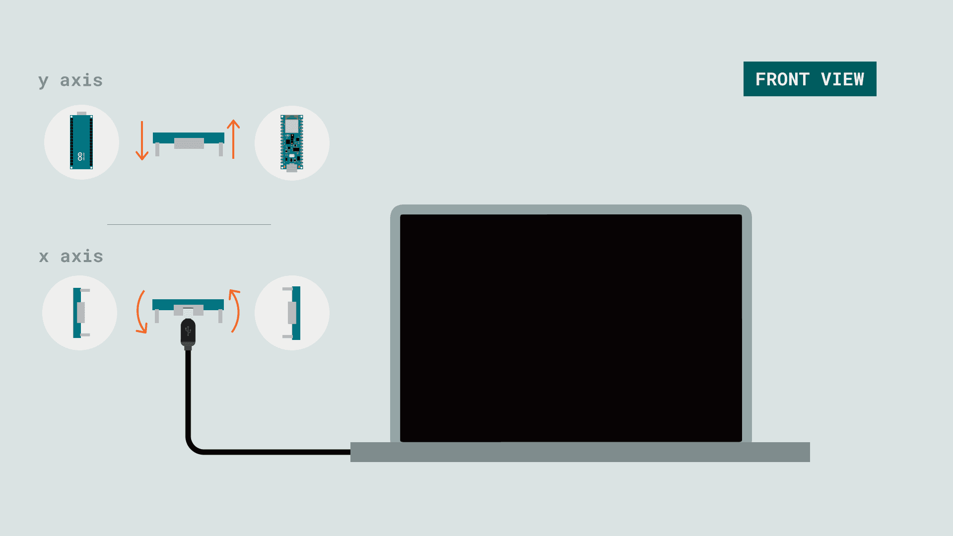 In order to get a correct reading of the board data, before uploading the sketch to the board hold the board in your hand, from the side of the USB port. The board should be facing up and "pointing" away from you. The image below illustrates the board's position and how it works: