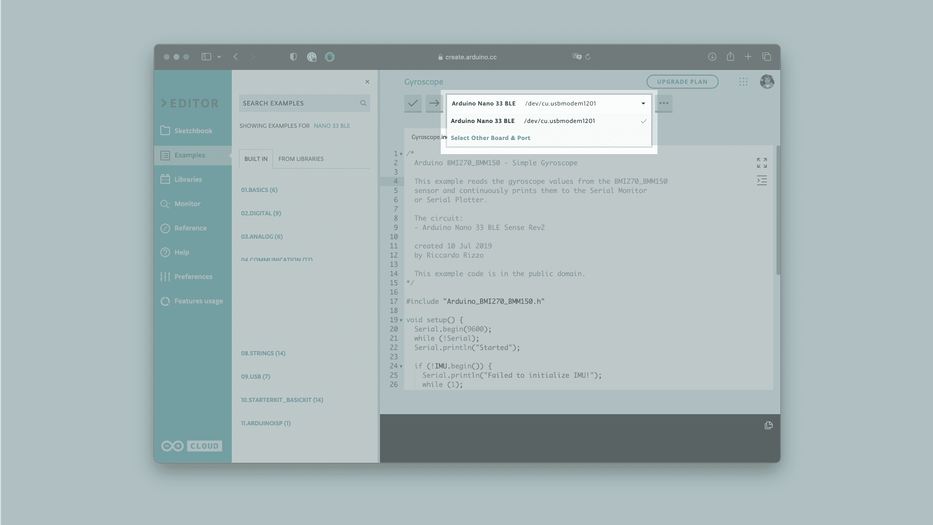 Let's start by opening the Arduino Web Editor, click on the Libraries tab and search for the BMI270_BMM150 library. Then in > Examples, open the SimpleGyroscope sketch and once it opens, rename it as Gyroscope.