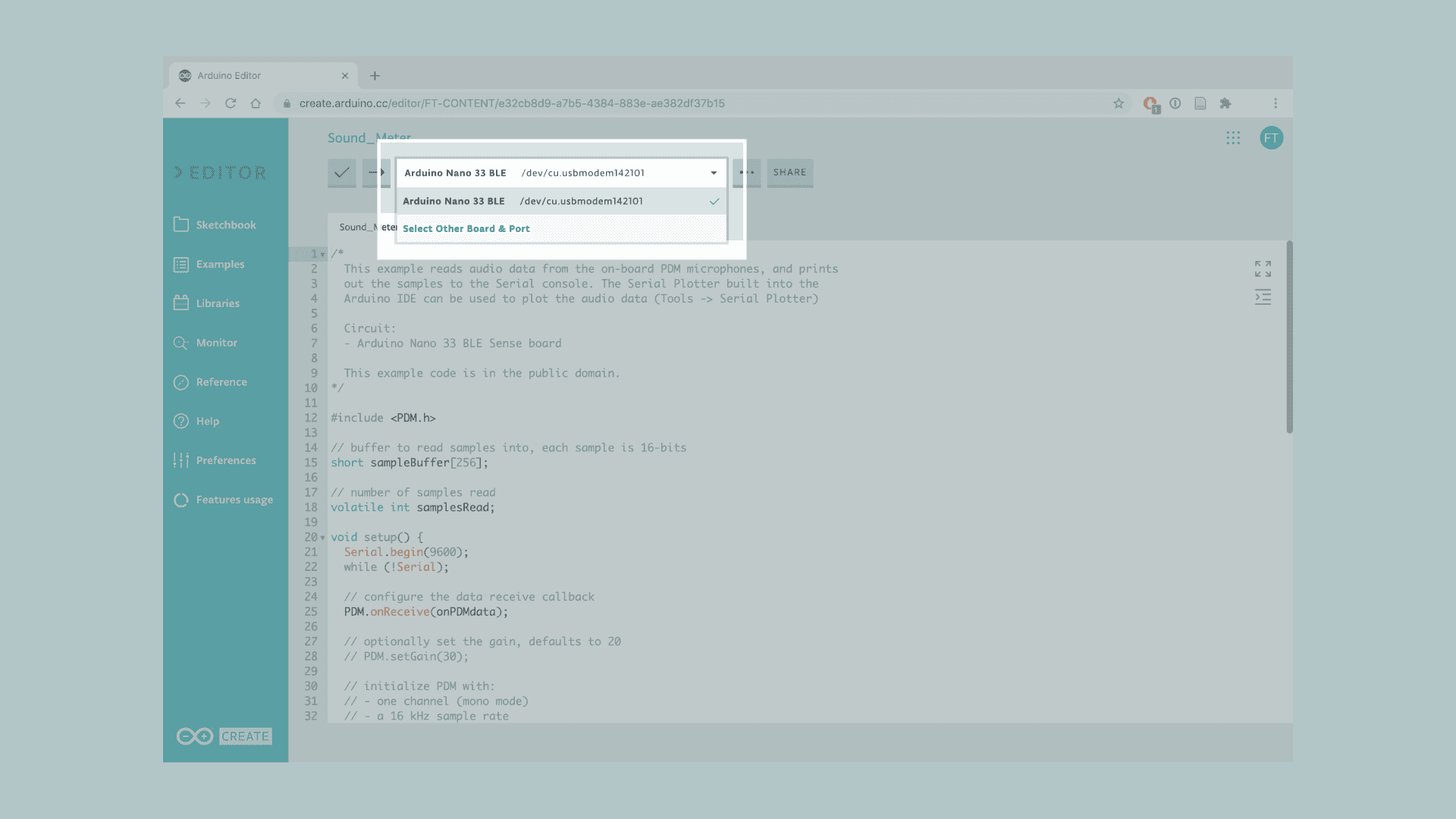 Let's start by opening the Arduino Web Editor, click on the Libraries tab, search for the PDM FOR MBED library, then in Examples, open the PDMSerialPlotter example. Once the sketch is open, rename it as Sound_Meter.