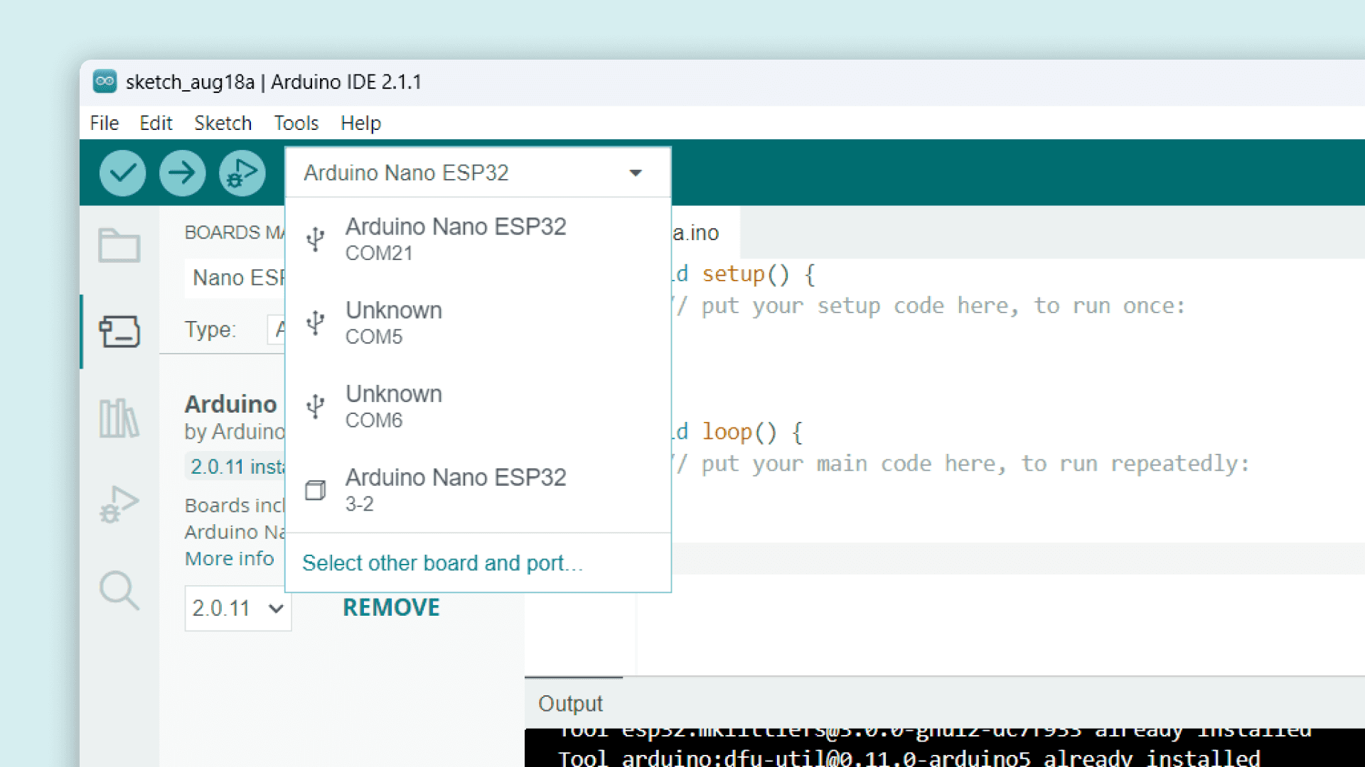 Note: You may see two versions for the Nano ESP32 available to pick in the board selector, one USB(COM21 in picture) and DFU(3-2 in picture). If you do, select the one with USB.