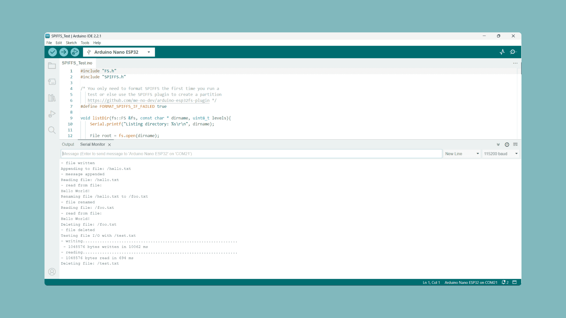 As mentioned above the code is taken from File > Examples > SPIFFS > SPIFFS_Test and can also be found inside the IDE's example section. It showcases different features available when using the SPIFSF file system.