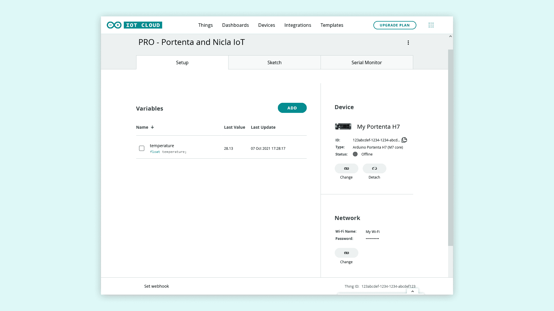 Create a new Thing at https://create.arduino.cc/iot/things, you can call it "PRO - Portenta and Nicla". You will need to attach the Portenta H7 as a new device to your Thing setup. After that, go to Variables, click the add button and select a float variable called temperature to store the temperature readings.