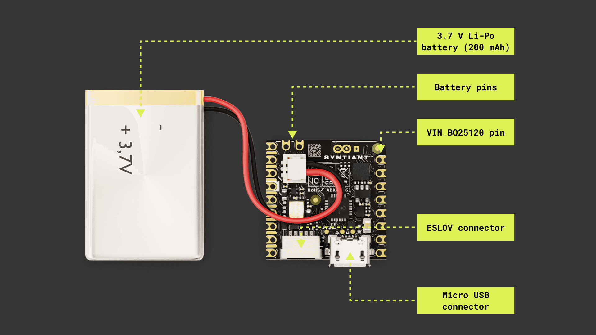 A 3.7V Li-Po battery can be also connected through the board's pins: