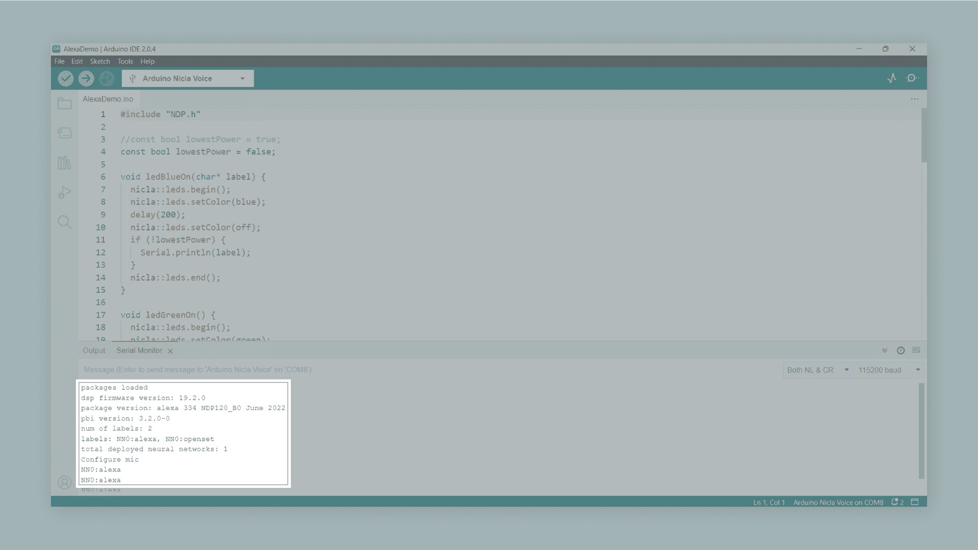 function, the code initializes the Nicla Voice board and sets up the Bluetooth® Low Energy service and characteristic; then, it begins advertising the defined Bluetooth® Low Energy service.