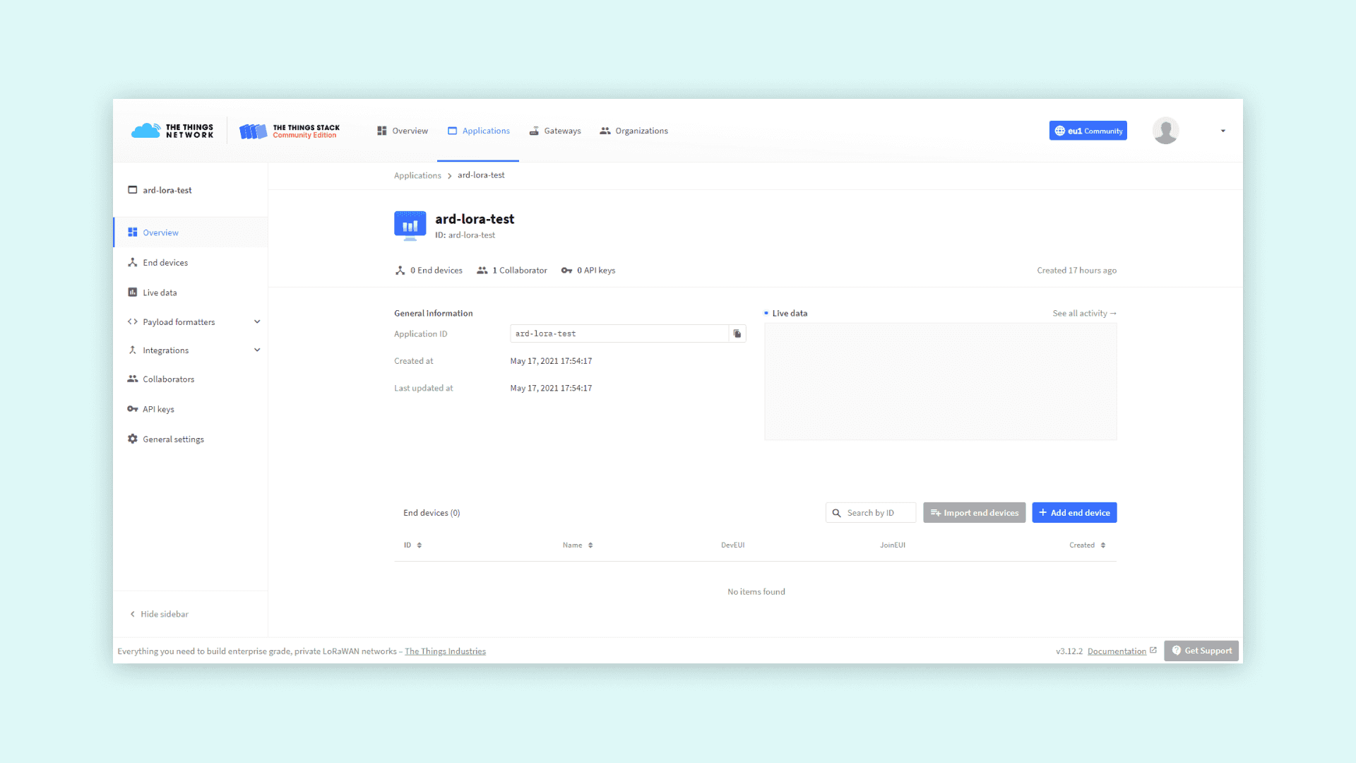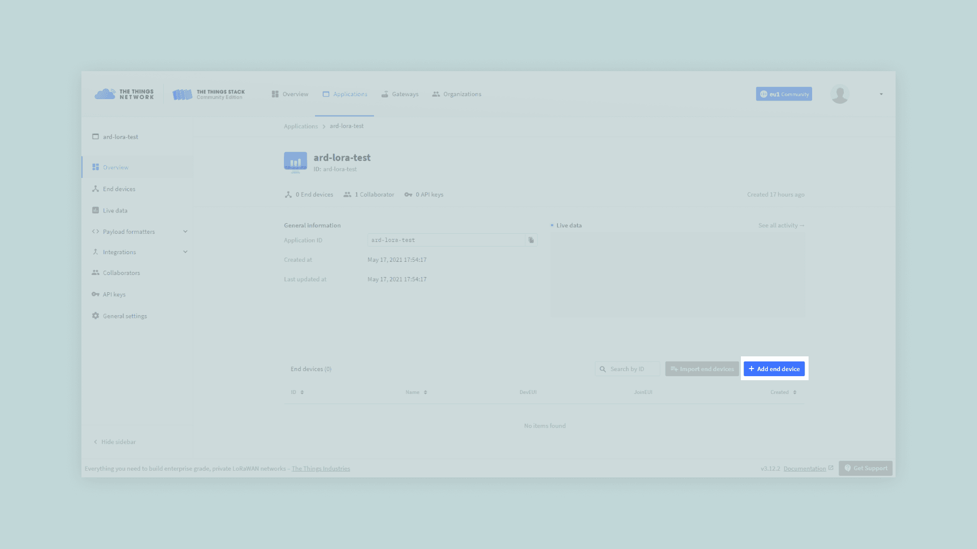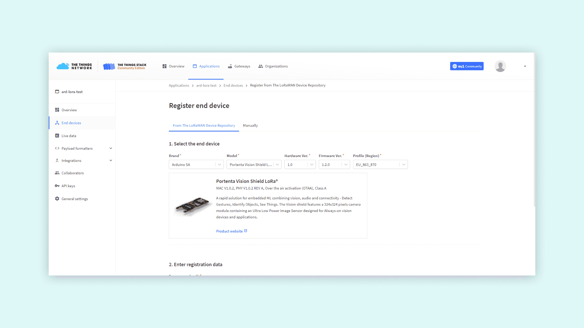 Before your Portenta H7 can start communicating with the TTN, you need to register the board with an application. Go back to the TTN portal and scroll to End devices section on your Application dashboard, then click Add end device.