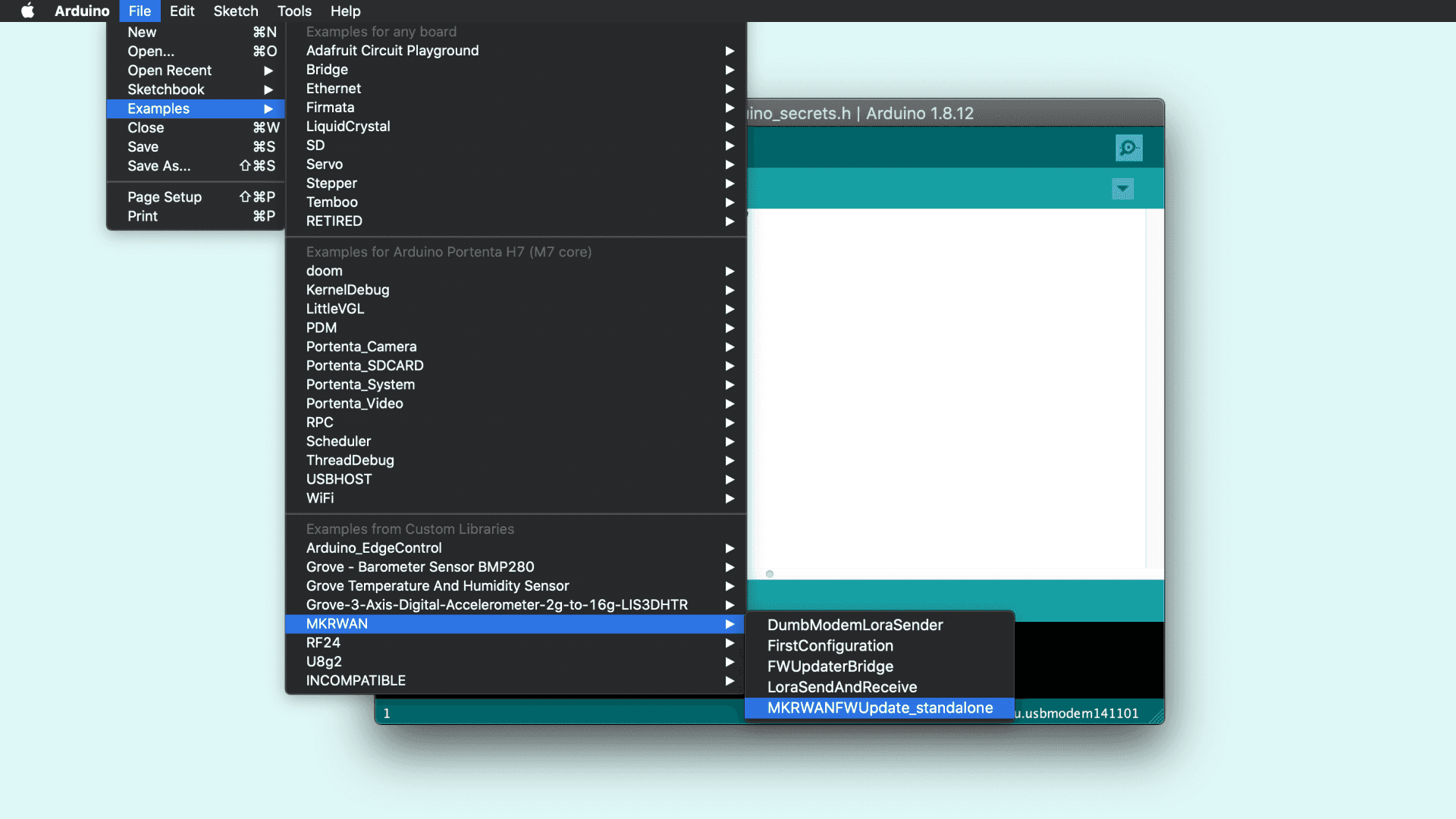 3. Open the MKRWANFWUpdate_standalone sketch from the Arduino IDE menu: File > Examples > MKRWAN.