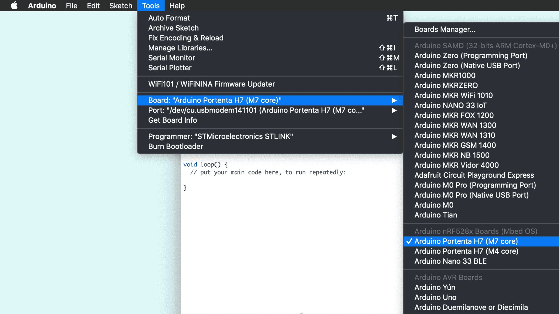 Plug the Portenta Vision Shield - LoRa to the Portenta H7 and them to your PC through the USB port. Be sure to have selected the right board "Arduino Portenta H7 (M7 core)" and the right port.