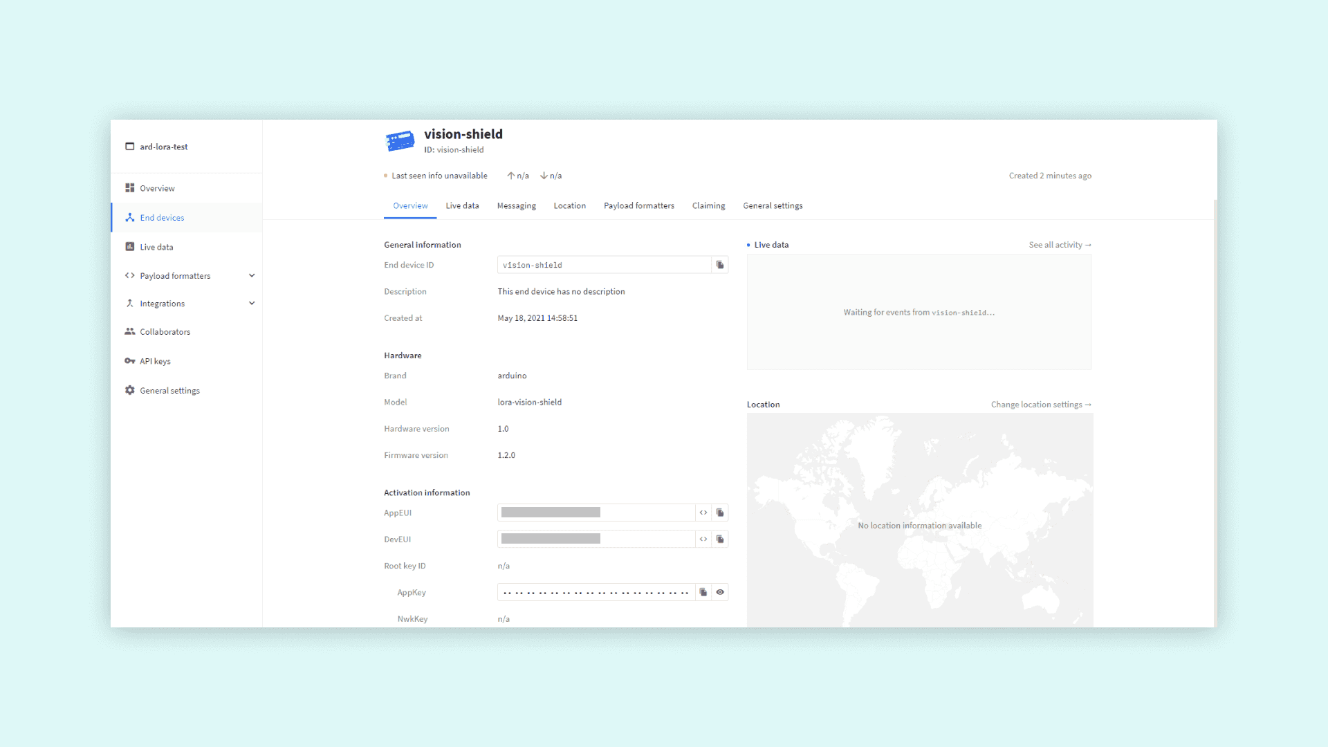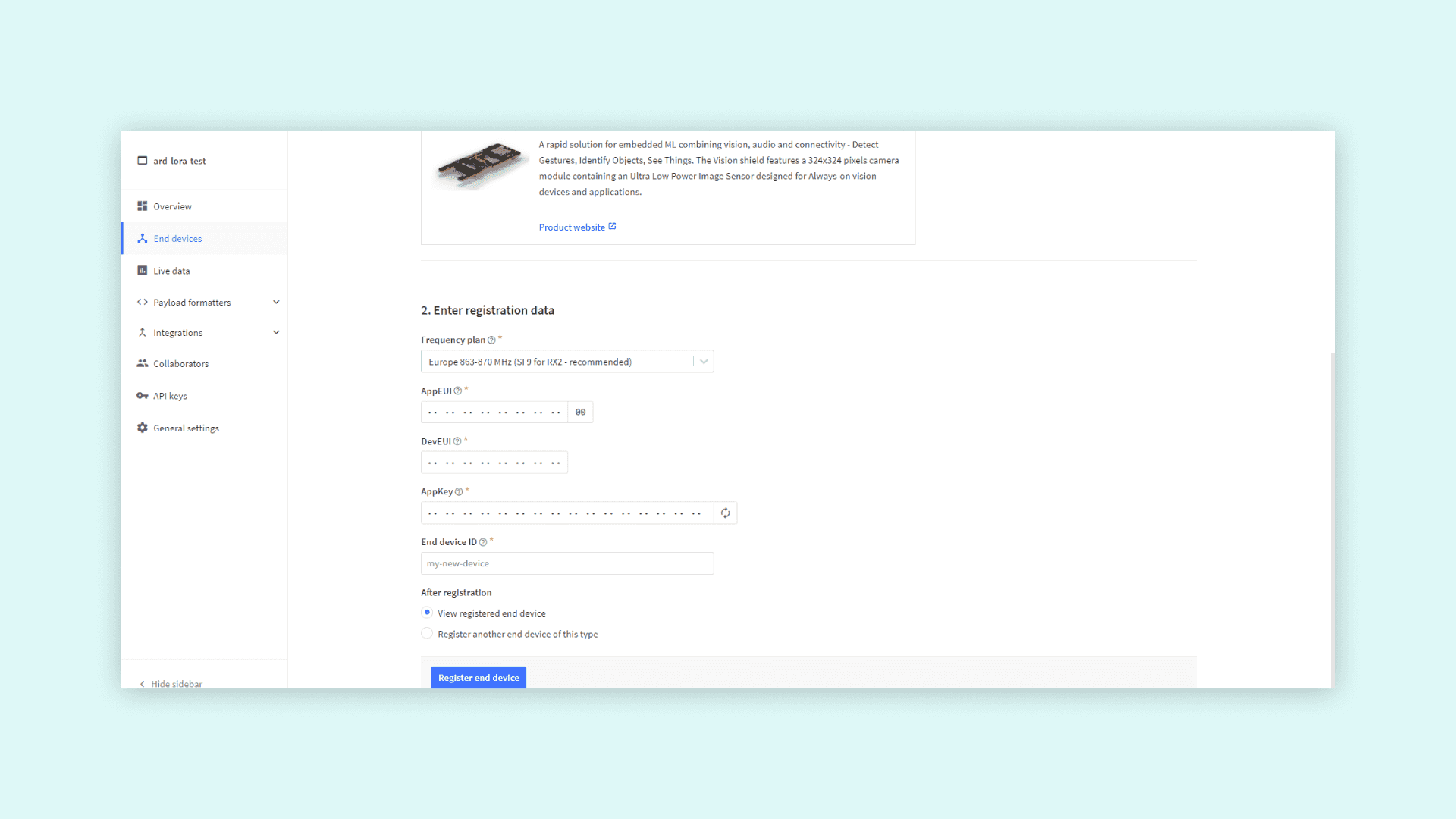 • End devices: here you can see and manage all the associated devices (e.g. your Portenta H7 with Portenta Vision Shield - LoRa, Arduino MKR WAN 1300 or MKR WAN 1310), or proceed with the registration of a new one. Registering a new device lets you generate an AppEUI and an AppKey.