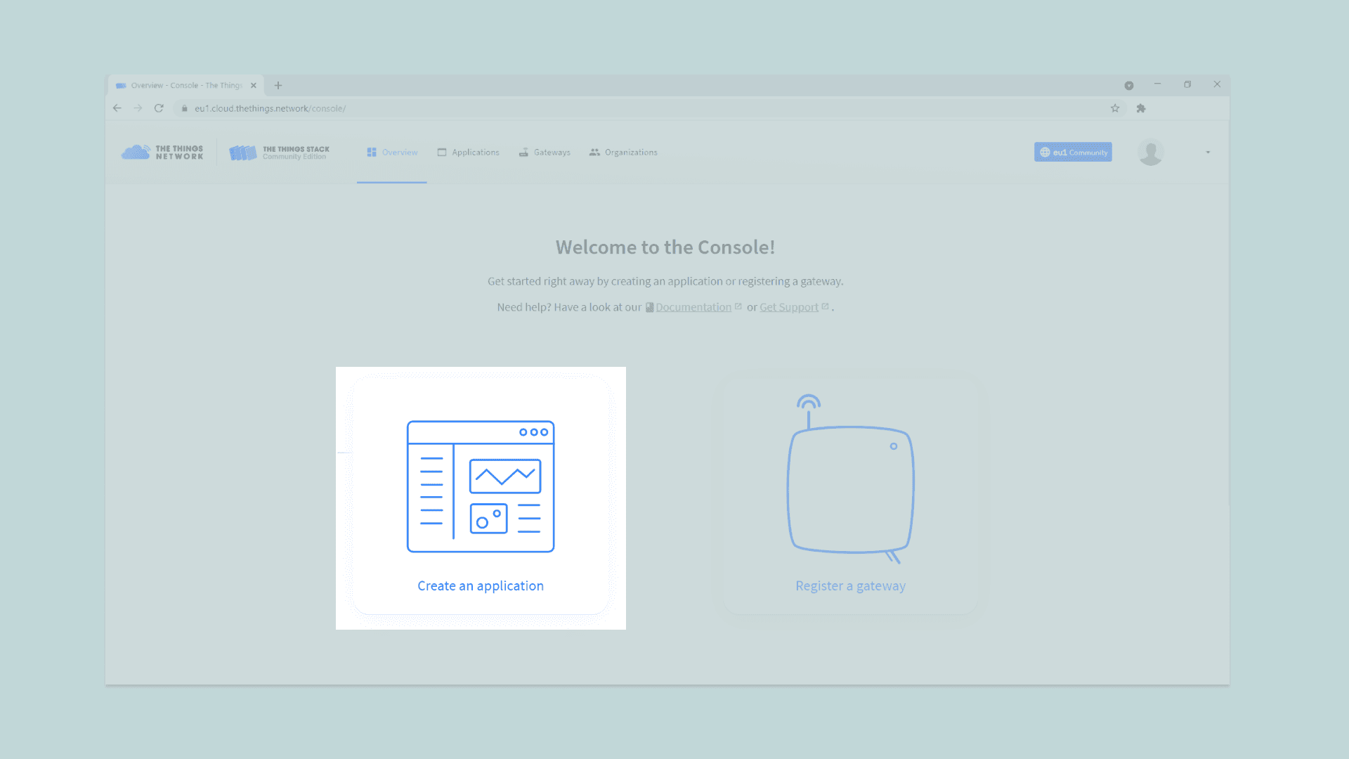 Once you have created an account with TTN, you need to create a TTN application. An application provides a way to aggregate data from different devices, and then use these data with other 3rd party integrations. After signing in, click on Create an application, or Go to applications if you already have created one.