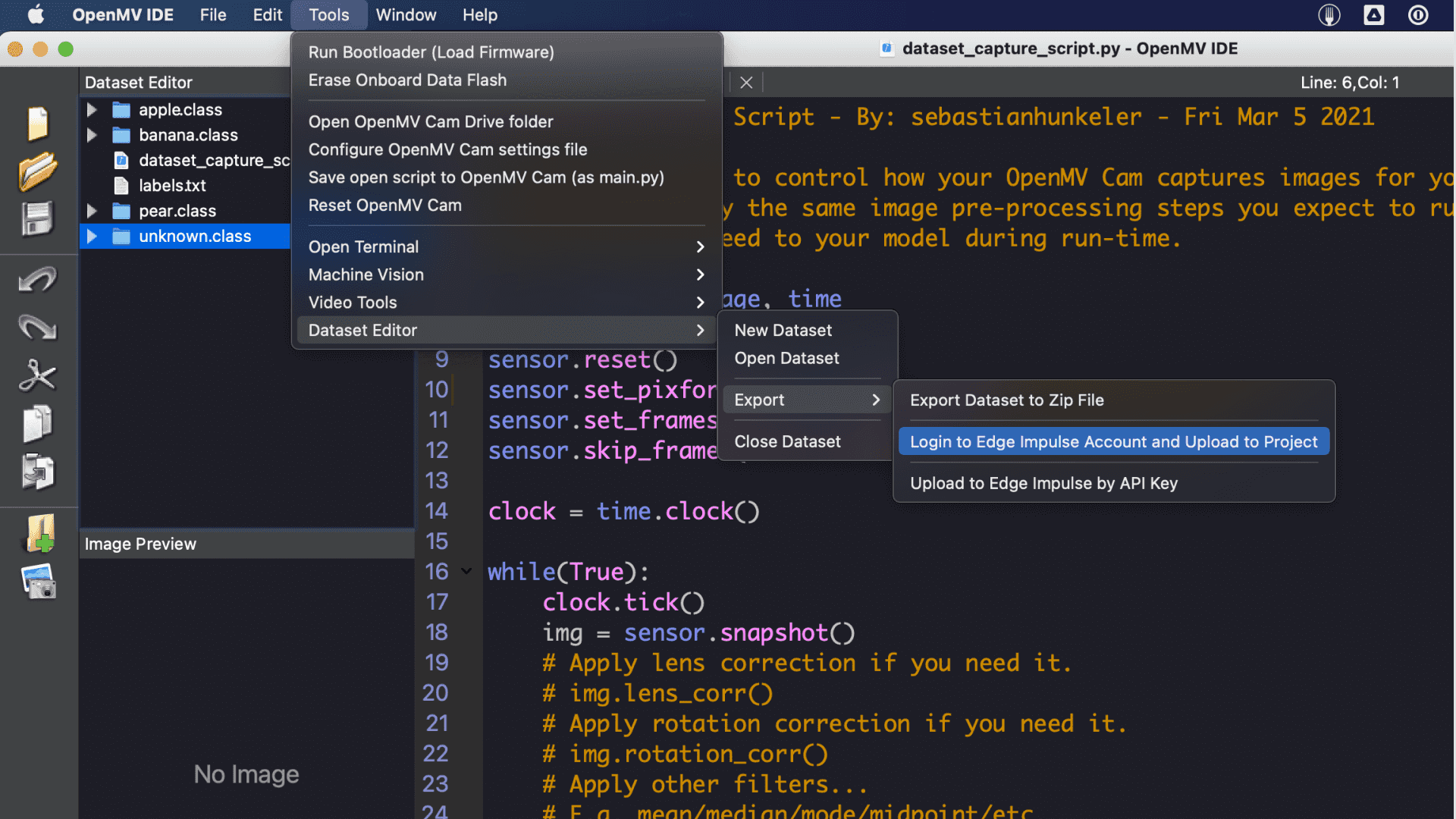 .After that, you can go back to the OpenMV IDE and select Tools > Dataset Editor > Export > Log in to Edge Impulse® Account and Upload to Project. The OpenMV IDE will ask you for your Edge Impulse® login credentials. Select the project that you just created and click OK. Leave the data set split setting at the default. This will keep 20% of the images aside for testing the model once it has been trained. That allows you to assess how well your model performs at detecting the objects with data that it has not seen yet.